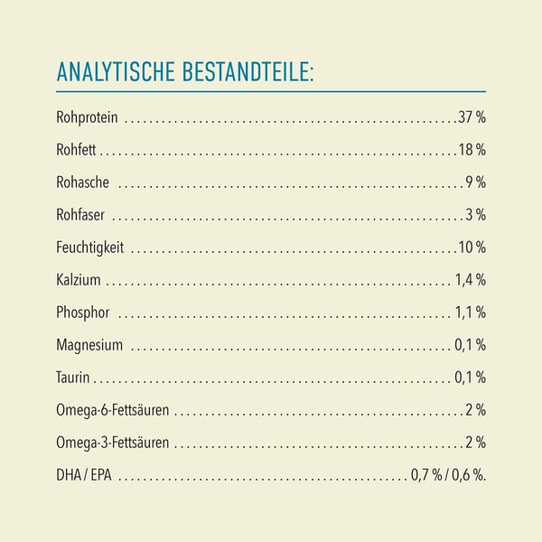 hrubá bílkovina 37 %, hrubý tuk 18 %, hrubá vláknina 3 %, hrubý popel 9 %, vápník 1,2 %, fosfor 0,9 %, hořčík 0,1 %, taurin 0,1 %, omega-6 2 %, omega-3 2,2 %, DHA/EPA 1 %/0,8 %