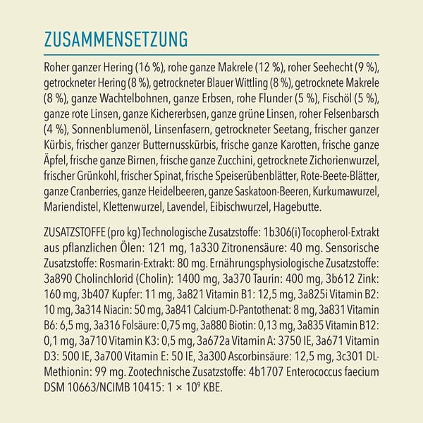 celý syrový sleď pacifický (14 %), celá syrová makrela pacifická (13 %), celá syrová štika (9 %), sušený sleď (8 %), sušená treska (8 %), sušená makrela (8 %), celé fazole pinto, celý hrášek, syrový platýs lovený ve volné přírodě (5 %), olej z tresčích jater (5 %), celá červená čočka, celá cizrna beraní, celá zelená čočka, celý syrový okoun (4 %), slunečnicový olej, vláknina z čočky, mrazem sušená tresčí játra (1 %), sušená řasa, celá čerstvá tykev obecná, celá čerstvá máslová dýně, čerstvá košťálová zelenina, čerstvý špenát, čerstvé listy ředkviček, čerstvá mrkev, čerstvá jablka, čerstvé hrušky, čerstvé celé brusinky, čerstvé celé borůvky, čekankový kořen, kořen kurkumy, ostropestřec mariánský, lopuchový kořen, levandule, pravý kořen ibišku, šípek.