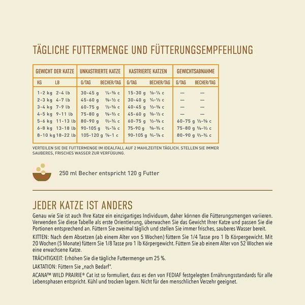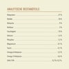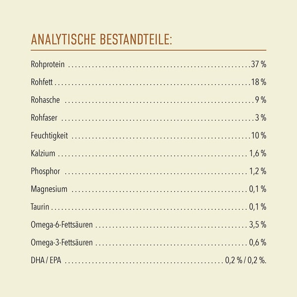 hrubá bílkovina 37 %, hrubý tuk 18 %, hrubá vláknina 3 %, hrubý popel 9 %, vápník 1,6 %, fosfor 1,2 %, hořčík 0,1 %, taurin 0,1 %, omega-6 3,5 %, omega-3 0,6 %, DHA/EPA 0,2 /0,2 %