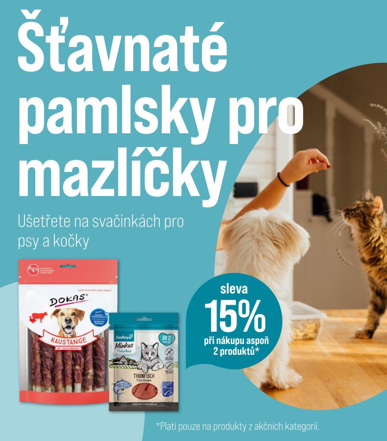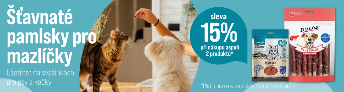 *Sleva 15 % s kódem "15zeDvou" při koupi alespoň dvou produktů z kategorií Pamlsky pro psy a Pamlsky pro kočky. U každé objednávky lze uplatnit pouze jeden kód, akce platí od 14.10.2024 do 01.12.2024.