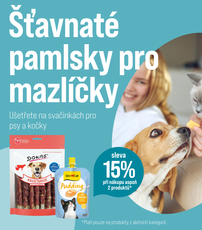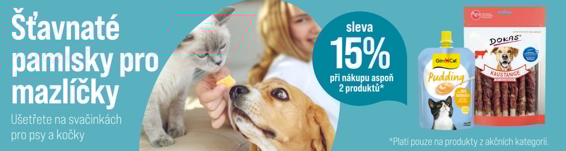 *Sleva 15 % na pamlsky pro psy a pamlsky pro kočky s kódem 15-chutne při koupi alespoň dvou balení pamlsků. Akce platí od 17.11.2025 do 04.01.2026 nebo do vyprodání zásob. U každé objednávky lze uplatnit pouze jeden kód.