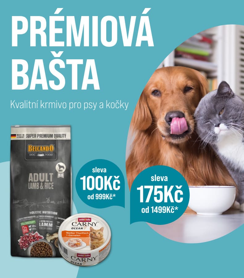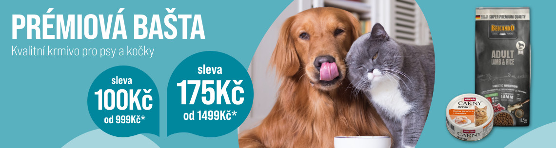 *Sleva 100 Kč od 999 Kč s kódem "premiove-M" a sleva 175 Kč od 1499 Kč s kódem "premiove-L" na krmiva na této akční stránce. Akce platí od 20.04.2026 do 03.05.2025 nebo do vyprodání zásob. U každé objednávky lze uplatnit pouze jeden kód.