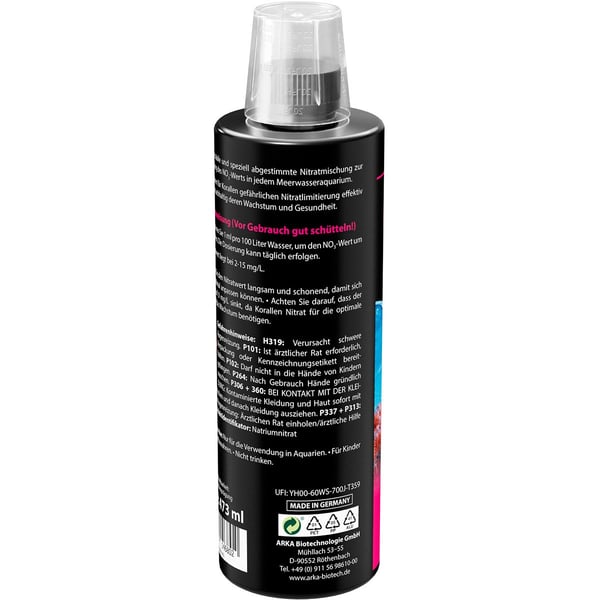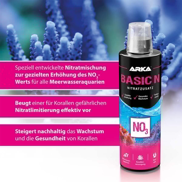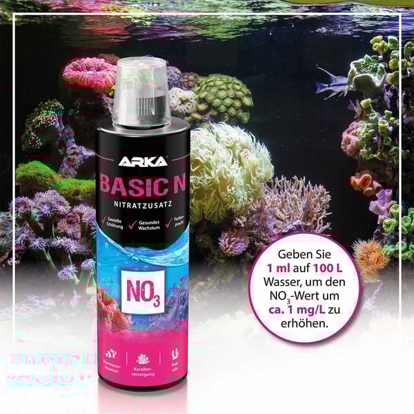 Pro udržení rovnováhy ve vašem akváriu je nezbytná pravidelná kontrola hodnot živin. Vezměte na vědomí, že zvýšení hodnoty NO3 může zvýšit spotřebu fosfátů. Ideální hodnota dusičnanů je 2-15 mg/l v mořské vodě. S ARKA BASIC N zajišťujete optimální péči a pohodu vašich korálů.