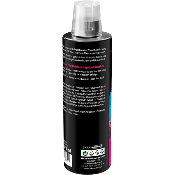 Dávkování: 10 ml na 100 l vody, aby se zvýšila hodnota PO4 o 0,1 mg/l. Dávkování může probíhat denně. Ideální hodnota fosfátu v mořském akváriu je 0,03-0,05 mg/l.
