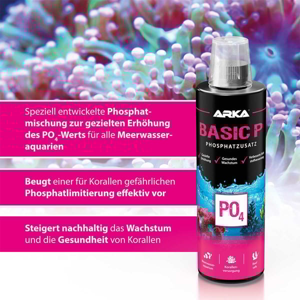 Dostatečný obsah fosfátu je rozhodující pro biologickou rovnováhu v akváriu. Jak nitrifikační, tak denitrifikační bakterie potřebují fosfát jako nosič energie. S ARKA BASIC P zajišťujete, že je vždy dostatek fosfátu k podpoře přirozené rovnováhy a pohody vašich korálů a rostlin.