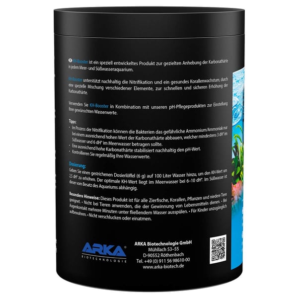 S Arka KH Booster uhličitanová tvrdost podporujete nitrifikaci ve vašem akváriu. Dostatečná uhličitanová tvrdost je rozhodující, aby bakterie mohly rozkládat nebezpečný amonium/amoniak. KH-Booster obsahuje speciální směs různých prvků, které tento proces udržitelně podporují. Tak přispíváte k tomu, že vaše akvárium zůstane zdravé a kvalita vody je optimální.