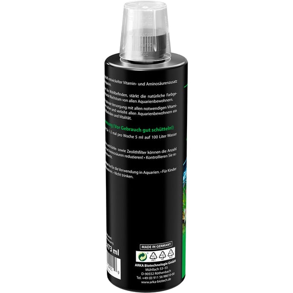 S ARKA VITAMINS zajistíte, že vaši akvarijní obyvatelé budou optimálně zásobeni všemi potřebnými vitamíny a aminokyselinami. Tato speciální formule je ideální pro všechna sladkovodní akvária a podporuje pohodu vašich ryb a rostlin. Pravidelné používání podporuje zdravé prostředí a zvyšuje vitalitu v akváriu.