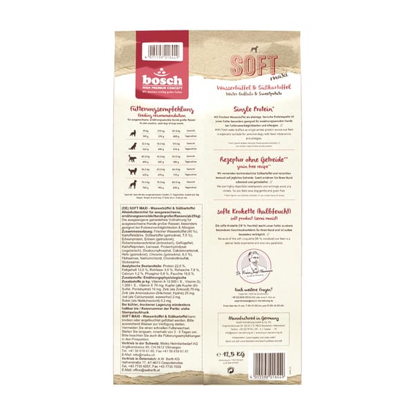 Bosch SOFT Maxi Divoký buvol a batáty je výrobek s obsahem jediné bílkoviny pro vyváženou a zdravou stravu dospělých velkých psů. Bosch SOFT Maxi Divoký buvol a batáty je ideální zejména pro psy citlivé na stravu, kteří trpí potravinovými intolerancemi a alergiemi.