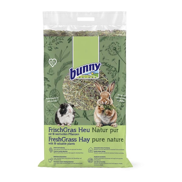 Hrubá struktura s tvrdými vlákny je důležitá pro obrušování zubů a všeobecnou péči o zuby. v Po posečení se seno šetrně suší ve stodole, protože trvalý déšť nebo intenzivní sluneční svit by zničily živiny. Seno značky Bunny z čerstvé trávy z oblasti Allgäu je krmivo se všemi cennými obsahovými látkami, které nám příroda nabízí.