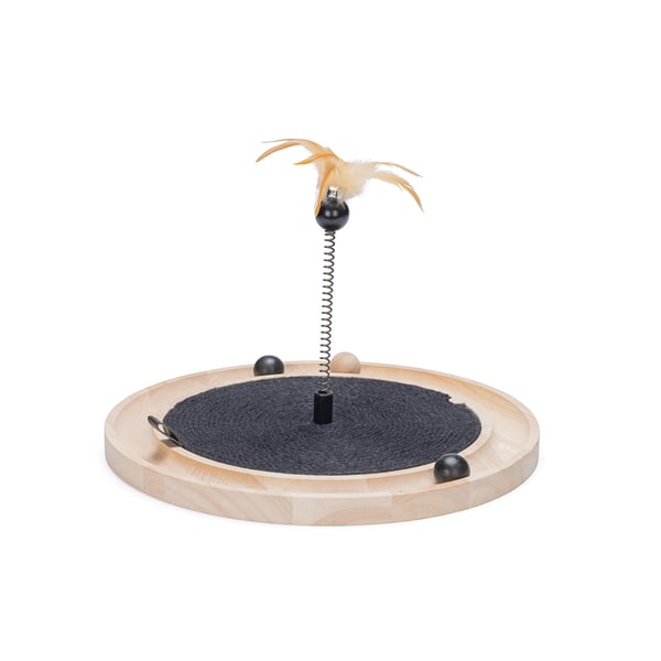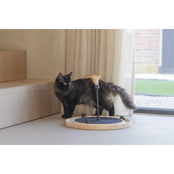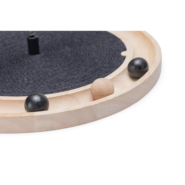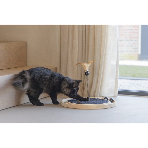 Flexibilní pružina s dřevěnou koulí a bočně zapuštěné dřevěné koule, které se kutálejí skrz štěrbinu, stimulují přirozené instinkty vaší kočky. Tato promyšlená hračka zajišťuje vzrušující lovecké hry a udržuje vaši kočku v pohybu. Filcové kluzáky navíc chrání vaši podlahu před poškrábáním.