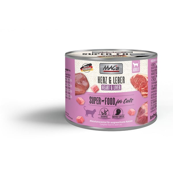 MAC‘s je krmivo v konzervě, které by mohlo být jen těžko lepší: Vyrábí se výhradně z masa a vedlejších produktů, které jsou schváleny také pro lidskou spotřebu. Vaše kočka tak dostane jen to nejlepší! Všechny druhy se skládají z minimálně 60–80 % masa a jsou doplněny o cenné minerály a o ovoce a zeleninu (podle druhu). Krmivo je tak zaměřeno na přirozenou výživu (divokých) koček.