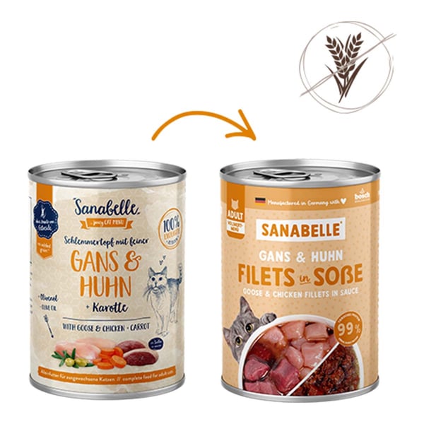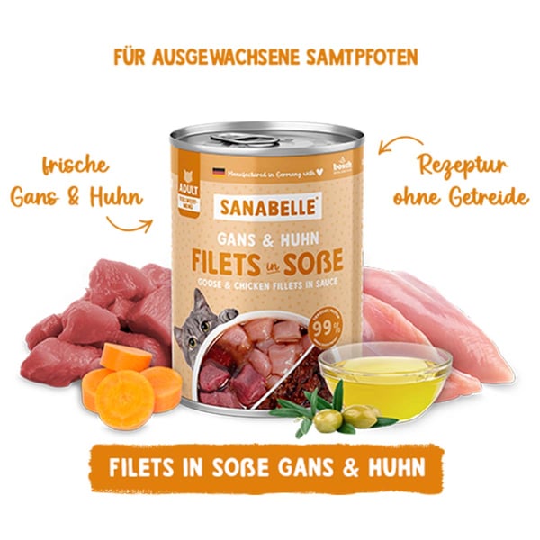 Sanabelle Adult jemná husa a kuřecím maso s mrkvičkami a olivovým olejem je kompletní krmivo pro dospělé kočky s masem té nejvyšší kvality v jemné omáčce.