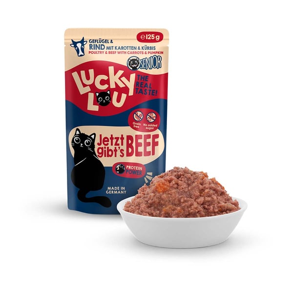 Nudné monotónní krmivo najdete jinde – Lucky Lou Lifestage je k dostání v 18 různých příchutích. Abyste mohli svým kočkám servírovat vždy čerstvé krmivo, je Lucky Lou Lifestage k dispozici v kapsičkách o obsahu 125 g a také v konzervách 200 g a 400 g. A samozřejmě jsou k dispozici i multipacky!