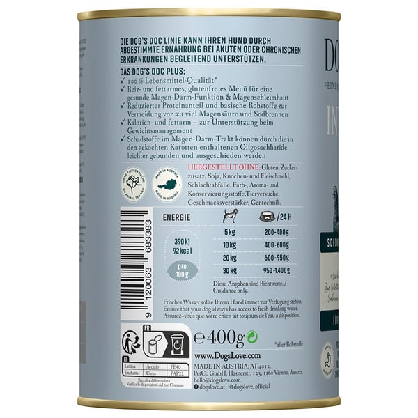 Dog's Love DOC Intestinal Light kuře nabízí vašemu psovi pečlivě vyváženou výživu s nejjemnějším kuřecím masem. Toto Super Premium konzervované krmivo je speciálně navrženo tak, aby podporovalo funkce žaludku a střev vašeho psa. Díky použití surovin v 100% potravinářské kvalitě si můžete být jisti, že váš pes dostává jen to nejlepší.