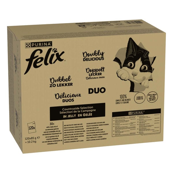 FELIX® Chutná tak dobře, jak vypadá® Doppelt Lecker je výběr neodolatelných jídel, která vypadají, voní a chutnají tak, jako byste je sami připravili. Každá varianta krmiva, vyrobená z kvalitních přísad, se skládá z jemných kousků, které v želé kombinují dva různé druhy příchutí, takže váš uličník může ochutnat dvě ze svých oblíbených chutí v jedné lahodné porci.