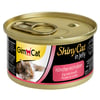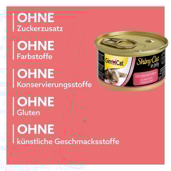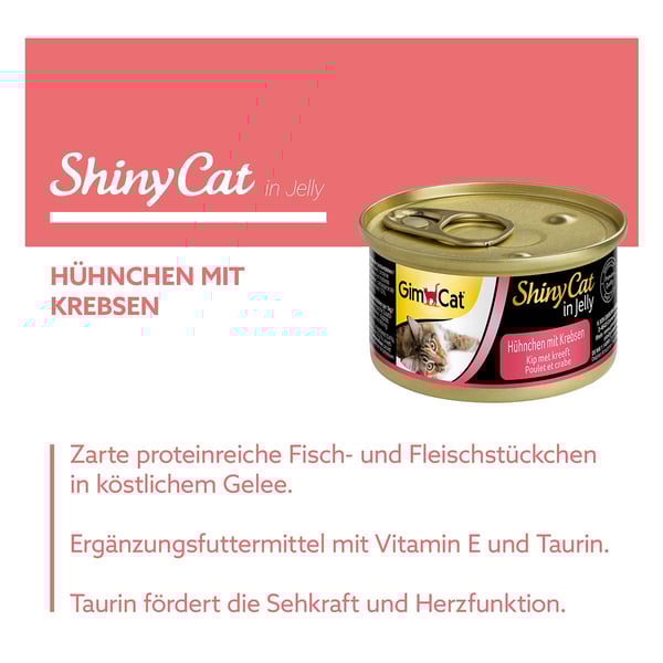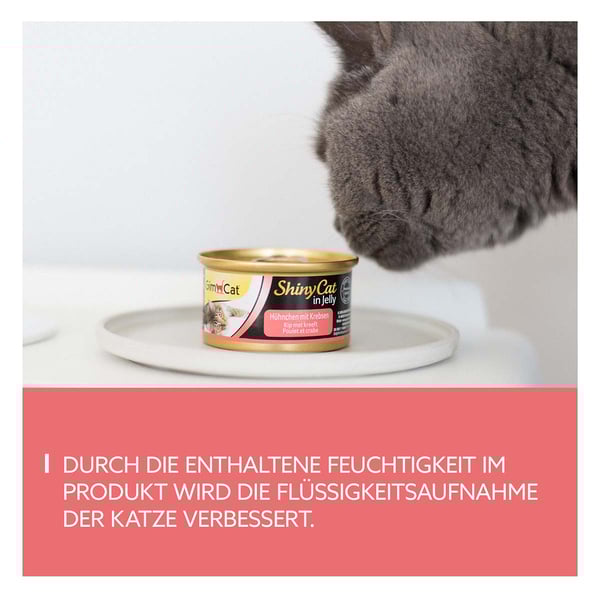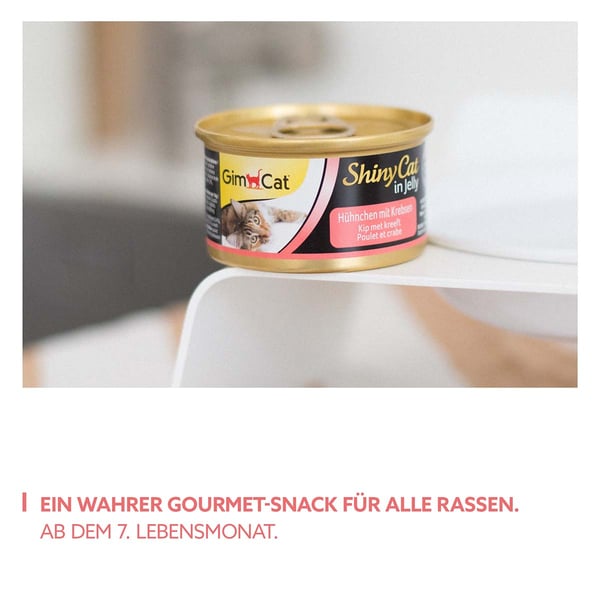 Na bílkoviny bohaté varianty GimCat ShinyCat v želé jsou nabízené s obzvláště chutnými kousky v lahodném želé, které jsou zvláště šťavnaté a jemné. Bohatství bílkovin je zaručeno díky mnoha druhům, díky tomu zabezpečí a posílí zdraví a imunitní systém vaší kočky. Vysoké kvality je dosaženo díky výběru přísad. Nedovolte, aby si vaše kočka nechala tuto kvalitu uniknout a přesvědčte ji touto mimořádnou chutí. Díky malému podílu tuku 1 % vhodné i pro kočky s nadváhou.