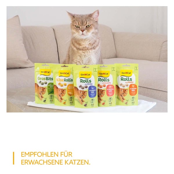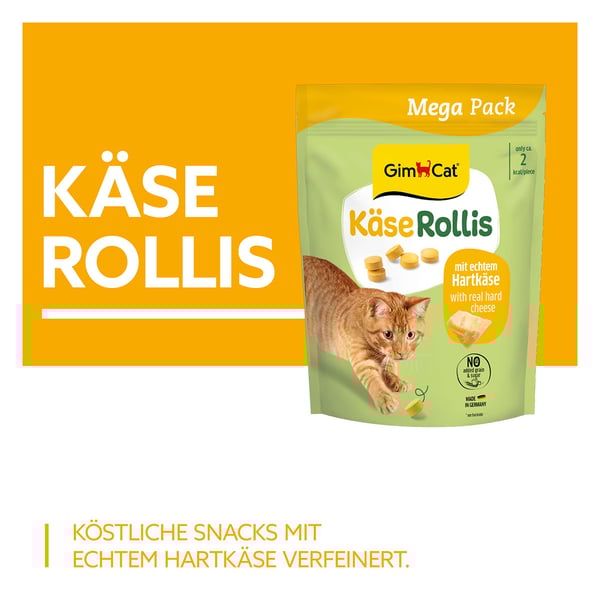 GimCat Käse-Rollis jsou lahodné pamlsky s pravým tvrdým sýrem. Při výrobě byly použity ty nejlepší suroviny a žádný cukr. Kuličky KäseRollis nejen že neodolatelně chutnají, ale navíc kočky lákají ke hře. Perfektní kombinace chuti a zábavy ze hry.