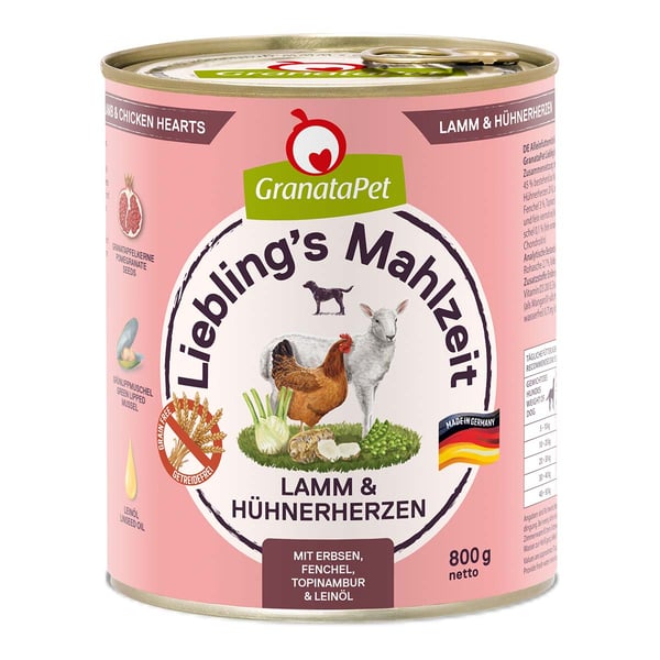 GranataPet mokré krmivo Liebling’ s Mahlzeit kuřecí maso a dýně má vysoký podíl masa.