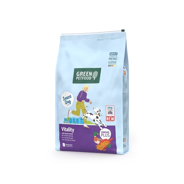 Green Petfood Vitality Insects & Duck nabízí vašemu psovi vyváženou výživu s cennými vitalizujícími látkami. Kombinace insektího a kachního proteinu zajišťuje harmonickou rovnováhu v misce. Receptura je speciálně navržena pro normálně aktivní, dospělé psy a podporuje každodenní vitalitu.