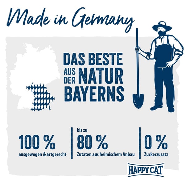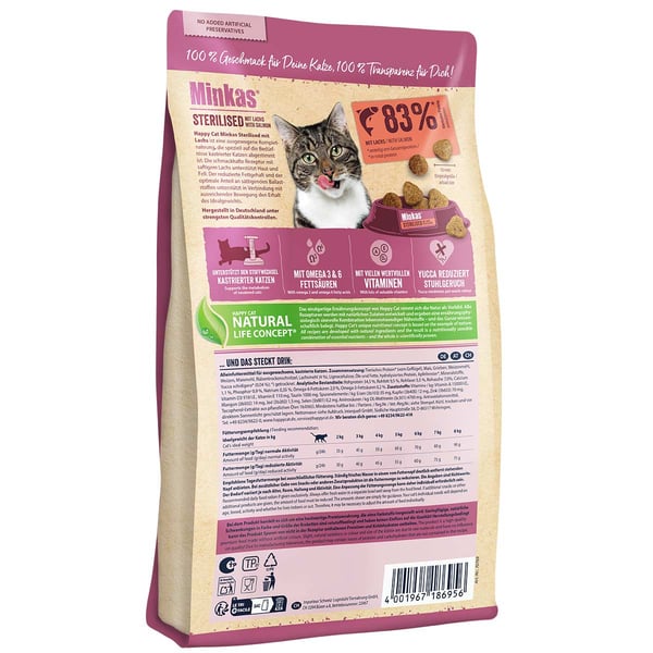 Happy Cat Minkas Sterilised Losos je vyroben v Německu a představuje nejvyšší kvalitu. Pečlivě vybrané ingredience a šetrné zpracování zaručují vysoce kvalitní produkt, kterému můžete důvěřovat. Tak si můžete být jisti, že vaše kočka dostává zdravou a vyváženou stravu, která odpovídá jejím potřebám.