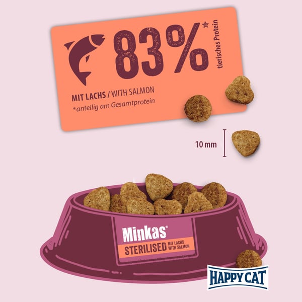 Happy Cat Minkas Sterilised Losos je speciálně přizpůsoben potřebám kastrovaných koček. Toto vyvážené kompletní krmivo nabízí vše, co vaše kočka potřebuje pro své blaho. Receptura se šťavnatým lososem nejenže zajišťuje lahodnou chuť, ale také podporuje péči o kůži a srst. Tak se vaše kočka cítí naprosto dobře.