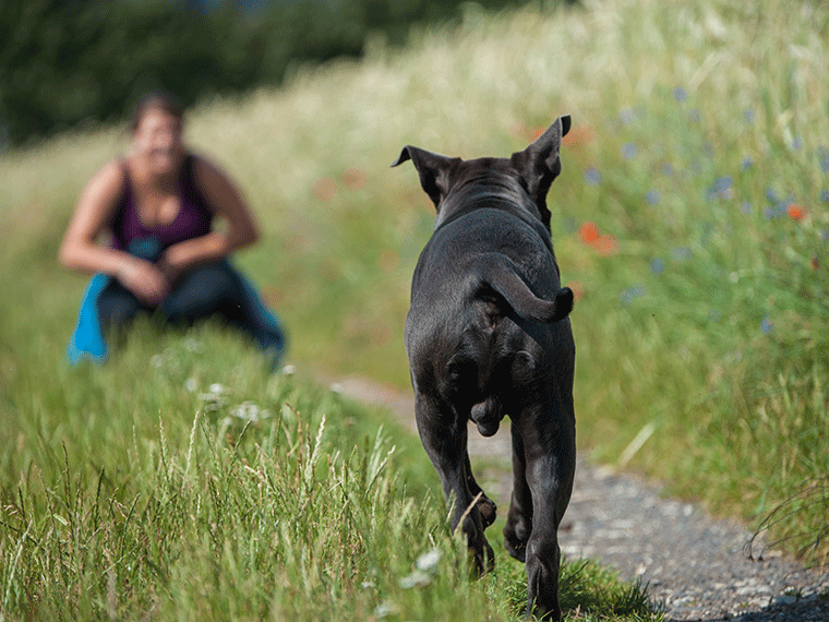 Postupně vzdálenosti zvětšujte. Pak jděte do další místnosti, v dalším kroku do zahrady, a pokud to všechno funguje dobře, můžete to vyzkoušet na procházce. Dbejte však na to, aby vás nic nerozptylovalo, protože přivolávací povel musí fungovat v každém případě. Protože nově naučené vzpomínky ještě nejsou upevněné, tj. nejsou ještě spolehlivé, neměli byste spěchat. Nejlepší je zvyšovat dávky pomalu a předem se ujistit, že to bude fungovat. Pokud je to možné, váš pes by neměl mít zkušenost, že nepřijít je možnost. Proto byste měli toto speciální zavolání používat s opatrností a nenadužívat ho jako běžný povel. Zvyšujte nároky po malých krocích.