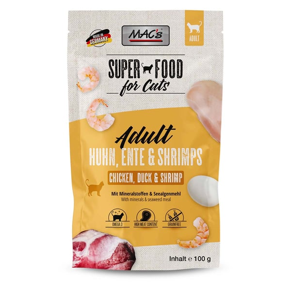 MAC kuře, kachna a krevety jsou chutnou kombinací křehké drůbeže a lahodných mořských plodů. Váš miláček si ji zamiluje. Jedinečná receptura neobsahuje obiloviny a byla vyvinuta jako vyvážená kompletní potrava. Díky šetrné přípravě a přidání vitamínů a minerálních látek je dosaženo přirozené stravy pro vaši kočku.