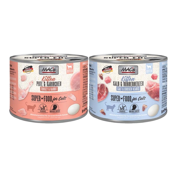 MAC’s Kitten je obzvlášť chutná kompozice s telecím a kuřecími srdci, která byla vyvinuta jako vyvážené kompletní krmivo pro koťata bez obsahu obilovin. Díky zvláštnímu profilu aminokyselin bude váš dospívající mazlíček zásoben vším, co potřebuje pro zdravý růst. Díky šetrné přípravě a přidání vitamínů a minerálních látek je dosaženo přirozené stravy pro vaši mladou kočku.