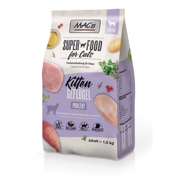MAC's Cat konzerva pro koťata s drůbežím masem dodá vaší kočce všechny důležité živiny, které potřebuje pro zdravý růst. Kompletní krmivo bez obilovin podporuje pohodu psa. Krmivo MAC's Kitten se vyznačuje vyváženým profilem aminokyselin. Olej z norského lososa obsahuje vysoký podíl omega mastných kyselin a stará se o zdravou kůži a lesklou srst. Brusinky působí jako přírodní probiotikum, v zažívacím traktu zabíjejí bakterie vyvolávající infekce. Díky šetrné přípravě a přídavku vitaminů a minerálních látek je dosaženo výživy vaší kočky, která se blíží přirozené stravě koček.