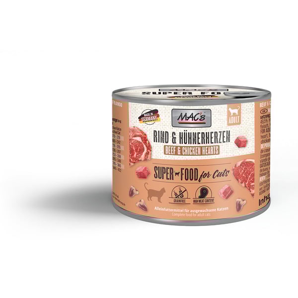 Masové menu MAC's Cat s hovězím masem a kuřecími srdíčky je vhodné zejména pro krmení náročných čtyřnohých mazlíčků. Kvalitní krmivo lze používat jako plnohodnotnou výživu a vyznačuje se obsahem podílu různých mas, který zahrnuje světlé i tmavé maso, od hovězího až po kuřecí. Konzervy a kapsičky bez obilovin jsou připravovány bez přídavků sacharidů, a jsou proto velmi zdravé. Tímto způsobem bude maximálně chráněn citlivý gastrointestinální systém Vašeho čtyřnohé miláčka. Zdravou výživu navíc zaručuje přidání vitamínů a minerálních látek.