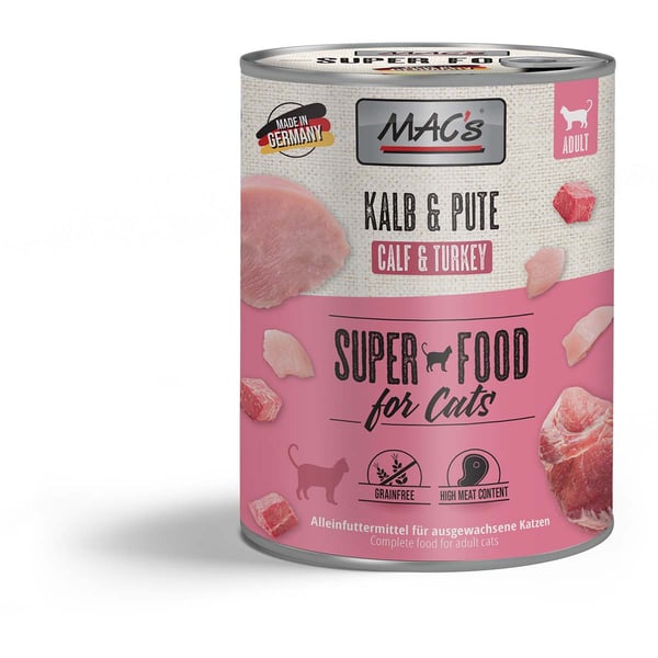 MACs telecí & krůtí maso poskytne vaší kočce krmivo s velmi vysokým podílem masa. Plnohodnotná strava bez obilovin byla vyvinuta důsledně bez přidání jakýchkoliv sacharidů. Kombinace čerstvého krůtího masa s čerstvým telecím je dobře snášena téměř všemi kočkami. Díky šetrné přípravě a přídavku vitaminů a minerálních látek je dosaženo výživy vaší kočky, která se blíží přirozené stravě koček.