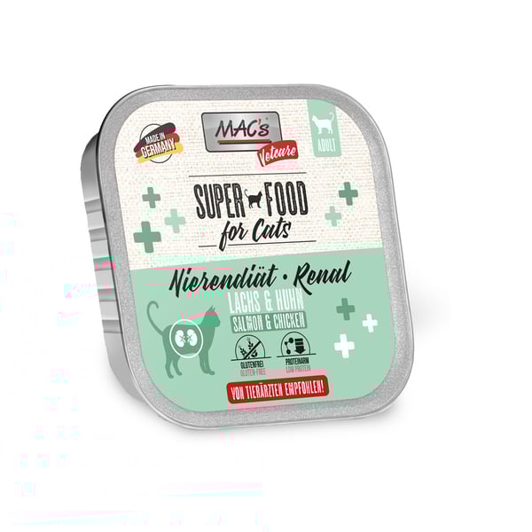 MAC's Nierendiät pro kočky, losos a kuře – podpora funkce ledvin při chronické nedostatečnosti. Četnost použití: Přinejmenším do 6 měsíců musí dobu používání krmiva v závislosti na dietní prognóze a průběhu onemocnění schválit zvěrolékař.