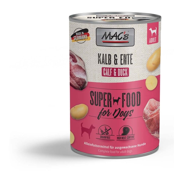 Zajistěte svému psovi s touto lahodnou konzervou vyváženou stravu. S konzervou pro psy MAC's Dog s telecím a kachnou přinášíte do misky to nejlepší. Krmivo je přizpůsobeno speciálně potřebám dospělých psů. Konzerva neobsahuje obiloviny a je doporučována především pro psy s alergiemi nebo intolerancemi. Přidané vitaminy mohou dodat vitalitu a zajistit více síly v každodenním životě. Pro normální funkci štítné žlázy je nezbytný jód. Mořské řasy jsou přirozeným zdrojem jódu.
