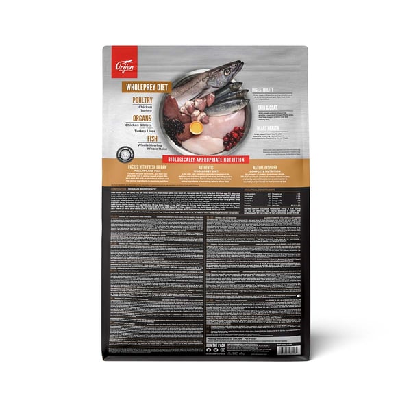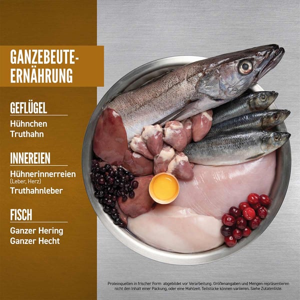 Čerstvé kuřecí maso (18 %), čerstvé krocaní maso (7 %), čerstvá celá vejce (5 %), čerstvá kuřecí játra (5 %), čerstvý celý platýs (4 %), čerstvý celý sleď (4 %), čerstvá krocaní játra (4 %), čerstvá kuřecí srdce (4 %), čerstvá krocaní srdce (4 %), čerstvé kuřecí krky (4 %), kuře (sušené, 4 %), krocan (sušený, 4 %), celé makrely (sušené, 4 %), celé sardinky (sušené, 4 %), celý sleď (sušený, 4 %), drůbeží tuk (3 %), červená čočka, zelený hrášek, zelená čočka, cizrna, žlutý hrách, vláknina z čočky, fazole pinto, bílé fazole, kuřecí chrupavky (sušené, 1 %), olej ze sledě (1 %), kuřecí játra (mrazem sušená), krocaní játra (mrazem sušená), čerstvá celá dýně, čerstvá celá muškátová dýně, čerstvá celá cuketa, čerstvý celý pastinák, čerstvá mrkev, čerstvá celá jablka, čerstvé celé hrušky, čerstvá kapusta kadeřávek, čerstvý špenát, čerstvé listy řepy, čerstvá vodnice, hnědé mořské řasy, celé brusinky, celé borůvky, celé plody muchovníku „Saskatoon“, kořen čekanky, kořene kurkumy, ostropestřec mariánský, kořen lopuchu, levandule, kořen proskurníku, šípky.