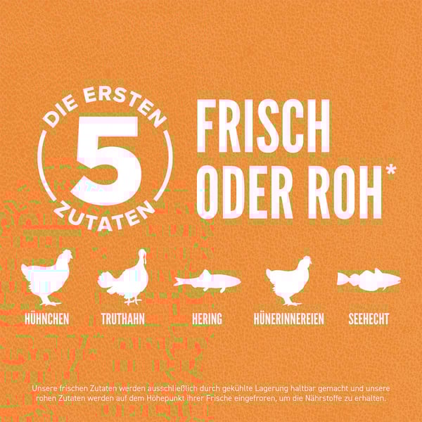 Při výrobě krmiva značky ORIJEN se zpracují 2/3 masa v ČERSTVÉM stavu (chlazené, bez konzervačních látek) nebo v SYROVÉM stavu (rychle mražené, bez konzervačních látek), mezi nimi také top 10 masových přísad. Toho nedosahuje žádné jiné krmivo pro kočky.