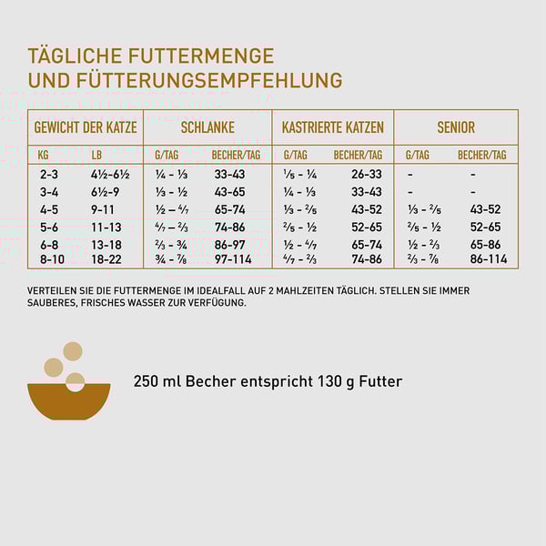 Kočka senior: 2 kg – 35 g, 3 kg – 35 g, 4 kg – 40 g, 5 kg – 65 g, 6 kg – 65 g, 8 kg – 85 g, 10 kg – 85 g