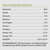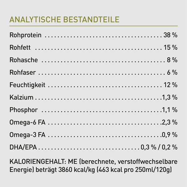 Analytické složky:Hrubá bílkovina 38 %, hrubý tuk 15 %, hrubý popel 8 %, hrubá vláknina 8 %, vlhkost 12 %, vápník/fosfor 1,3 % / 1,1 %, omega-6/3 2,3 % / 0,9 %, DHA/EPA 0,3 % / 0,2 %, glukosamin 1 400 mg/kg, chondroitin 1 200 mg/kg