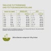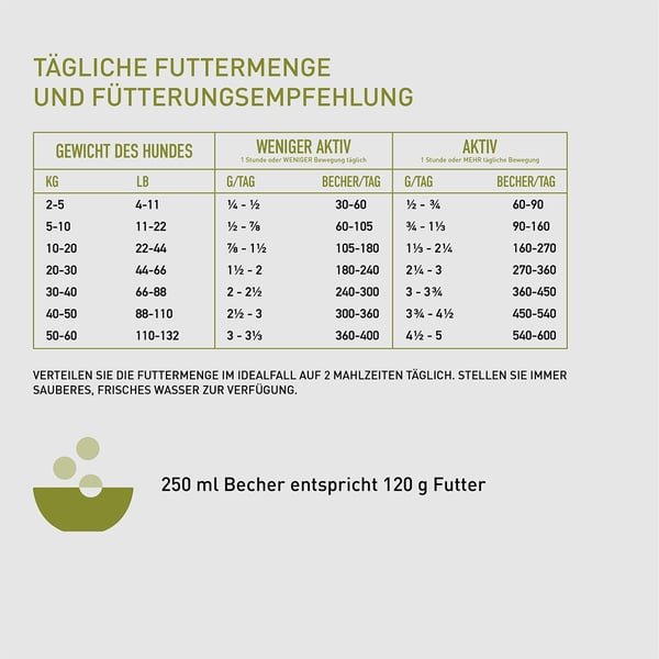 Aktivní pes: 5 kg = 90 g, 10 kg = 160 g, 20 kg = 270 g, 30 kg = 360 g, 40 kg = 440 g, 50 kg = 520 g, 60 kg = 600 g