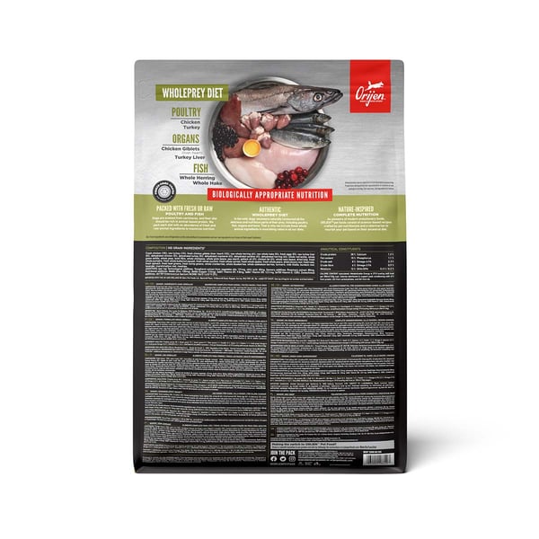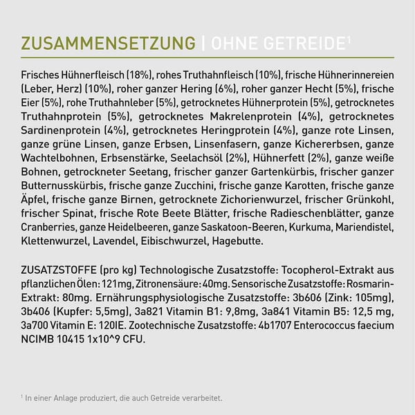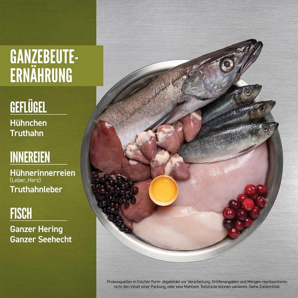 Čerstvé kuřecí maso (13 %), čerstvá celá vejce (7 %), čerstvé krocaní maso (7 %), čerstvý celý sleď (7 %), čerstvá kuřecí játra (6 %), čerstvý celý platýs (4 %), čerstvá krocaní játra (4 %), čerstvé kuřecí krky (4 %), čerstvá kuřecí srdce (4 %), čerstvá krocaní srdce (4 %), kuřecí maso (sušené 4 %), krocan (sušený 4 %), celé makrely (sušené 4 %), celé sardinky (sušené 4 %), celý sleď (sušený 4 %), červená čočka, zelená čočka, zelený hrášek, vláknina z čočky, cizrna, žlutý hrách, fazole pinto, kuřecí chrupavky (1 %), celé bílé fazole, olej ze sledě (1 %), drůbeží tuk (1 %), krocaní chrupavky (1 %), kuřecí játra (mrazem sušená), krocaní játra (mrazem sušená), čerstvá celá dýně, čerstvá celá muškátová dýně, čerstvá celá cuketa, čerstvý celý pastinák, čerstvá mrkev, čerstvá celá jablka, čerstvé celé hrušky, čerstvá kapusta kadeřávek, čerstvý špenát, čerstvé listy řepy, čerstvá vodnice, hnědé mořské řasy, celé brusinky, celé borůvky, celé plody muchovníku „Saskatoon“, kořen čekanky, kořene kurkumy, ostropestřec mariánský, kořen lopuchu, levandule, kořen proskurníku, šípky.