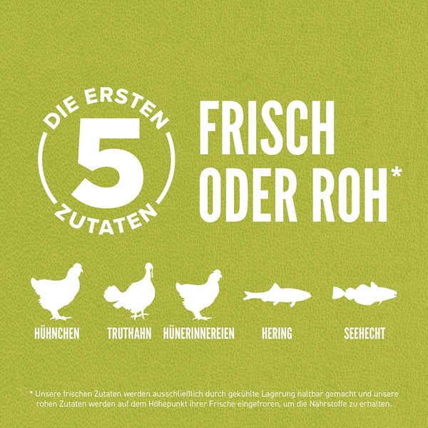 Při výrobě krmiva značky ORIJEN se zpracují 2/3 masa v ČERSTVÉM stavu (chlazené, bez konzervačních látek) nebo v SYROVÉM stavu (rychle mražené, bez konzervačních látek), mezi nimi také top 10 masových přísad. Toho nedosahuje žádné jiné krmivo pro psy.