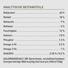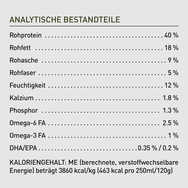 hrubá bílkovina 40 %, hrubý tuk 18 %, hrubý popel 9 %, hrubá vláknina 5 %, vlhkost 12 %, DHA 0,35 %, EPA 0,2 %, vápník 1,8 %, fosfor 1,3 %, omega-6 2,5 %, omega-3 1 %