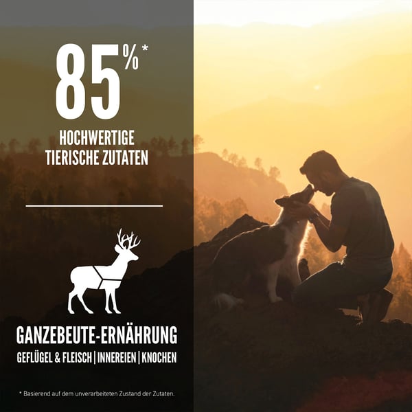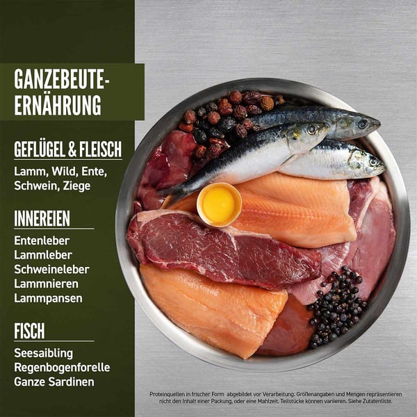 Čerstvé kozí maso (5 %), čerstvé kančí maso (5 %), čerstvý siven severní (4,5 %), čerstvé jelení maso (4,5 %), čerstvý pstruh duhový (4,5 %), čerstvé kachní maso (4,5 %), čerstvá kachní játra (4,5 %), čerstvé skopové maso (4,5 %), čerstvé celé sardinky (4 %), čerstvá skopová játra (4 %), jehněčí (3,5 %), kachna (3,5 %), treska obecná (3,55 %), skopové (3,5 %), celá treska modravá (3,5 %), celý sleď (3,5 %), celá makrela (3 %), celá červená čočka, celá zelená čočka, celé fazole pinto, celý zelený hrášek, celá cizrna beraní, vláknina z čočky, kančí játra (2 %), kachní tuk (2 %), přírodní aroma vepřového masa (2 %), lososový olej (2 %), celé zelené fazolky, celý žlutý hrách, kozí chrupavky, čerstvá kozí játra (1 %), čerstvé kozí dršťky (1 %), čerstvé skopové dršťky (1 %), čerstvé kančí vnitřnosti (1 %), čerstvá jelení játra (1 %), čerstvé jelení srdce (1 %), čerstvé kančí srdce (1 %), čerstvé kozí srdce (1 %), hnědé mořské řasy, mrazem sušená kozí játra (0,05%), mrazem sušená jelení játra (0,05%), máslová dýně, cuketa, pastinák, mrkev, jablka, hrušky, kapusta kadeřavá, špenátové listy, listy červené řepy, listy ředkviček, celé brusinky, celé borůvky, čekankový kořen, kurkuma, lopuchový kořen, levandule, pravý kořen ibišku, šípek.