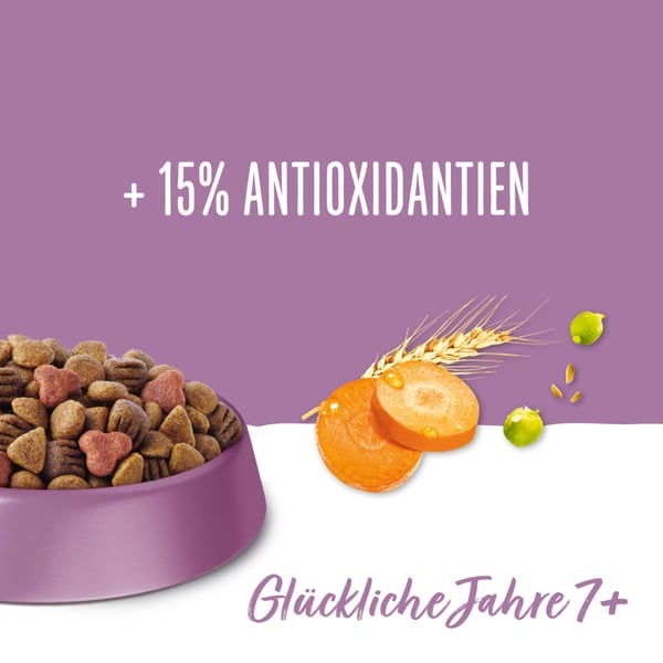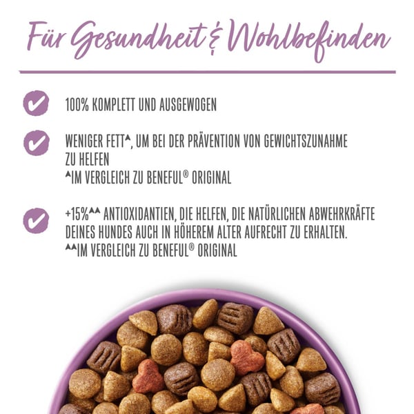 Receptura obsahuje vitamín A, který přispívá k udržení dobrého zraku. Krmivo pro psy s nízkým obsahem tuku zabraňuje přírůstku hmotnosti starších psů. O 15 % více antioxidantů (ve srovnání s krmivem BENEFUL Original) pomáhá udržovat přirozenou obranyschopnost těla ve druhé polovině života psa na stabilní úrovni. Naše prémiová směs krmiva pro psy obsahuje měkké kousky a křupavé krokety a je speciálně přizpůsobena potřebám starších psů. Usnadňuje jim žvýkání a hodí se jak pro malá, tak i pro velká plemena psů.