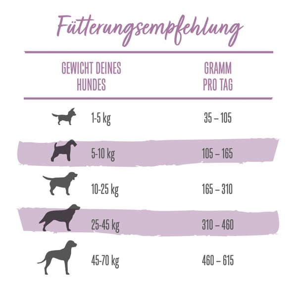 Uvedené hodnoty se vztahují na mírně aktivní psy žijící za normálních teplotních podmínek. Protože individuální potřeby kolísají, mělo by se množství krmiva vždy upravovat tak, aby si pes udržel štíhlé tělo a zdravou tělesnou hmotnost. K dispozici by vždy mělo být dostatečné množství čerstvé a čisté vody.
