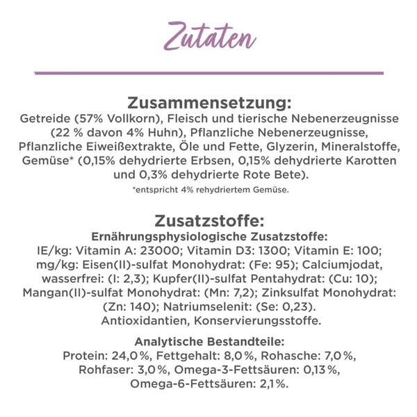 obiloviny (55% celozrnné obiloviny), maso a vedlejší produkty živočišného původu (18 %, z toho 4 % kuře), rostlinné bílkovinné extrakty, vedlejší produkty rostlinného původu, oleje a tuky, glycerin, minerální látky, zelenina* (0,25 % dehydrovaná zelenina (0,08 % dehydrovaný hrách, 0,08 % dehydrovaná mrkev a 0,08 % dehydrovaný špenát)).