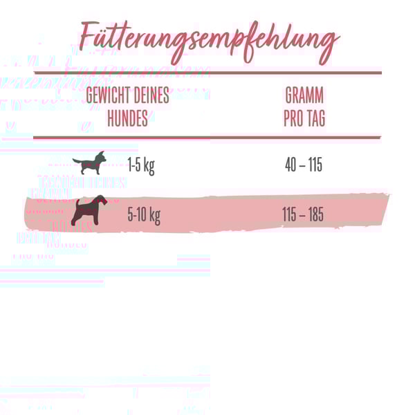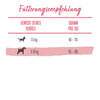 Uvedené hodnoty se vztahují na mírně aktivní psy žijící za normálních teplotních podmínek. Protože individuální potřeby kolísají, mělo by se množství krmiva vždy upravovat tak, aby si pes udržel štíhlé tělo a zdravou tělesnou hmotnost. K dispozici by vždy mělo být dostatečné množství čerstvé a čisté vody.