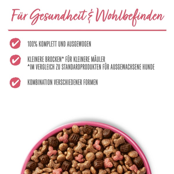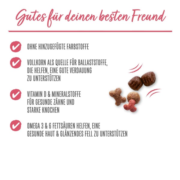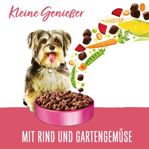 Originální krmivo pro malé psy: PURINA BENEFUL Kleine Genießer granule pro psy jsou se svými menšími kousky ve srovnání s krmivem PURINA BENEFUL Original vhodné pro menší tlamičky a měkké kousky a křupavé granule zajistí vašemu nejlepšímu příteli lahodný chuťový zážitek. Zatímco cenná vláknina z plných zrn podporuje dobré trávení, zajišťují důležité omega 3 a 6 mastné kyseliny zářivou srst a zdravou kůži. Toto prémiové krmivo pro psy je kvalitním zdrojem bílkovin, které pomáhají udržovat silné svalstvo.