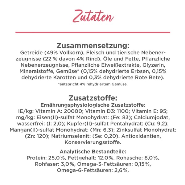 obiloviny (43 % plné zrno), maso a vedlejší produkty živočišného původu (18 % z toho 4 % hovězí), rostlinné bílkovinné extrakty, vedlejší produkty rostlinného původu, oleje a tuky, glycerin, minerální látky, zelenina* (0,25 % dehydrovaná zelenina (0,08 % dehydrovaný hrášek, 0,08 % dehydrovaná mrkev a 0,08 % dehydrovaný špenát)).