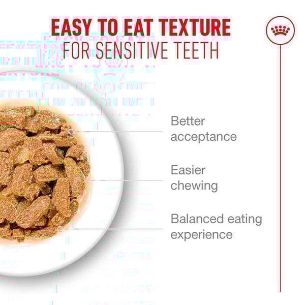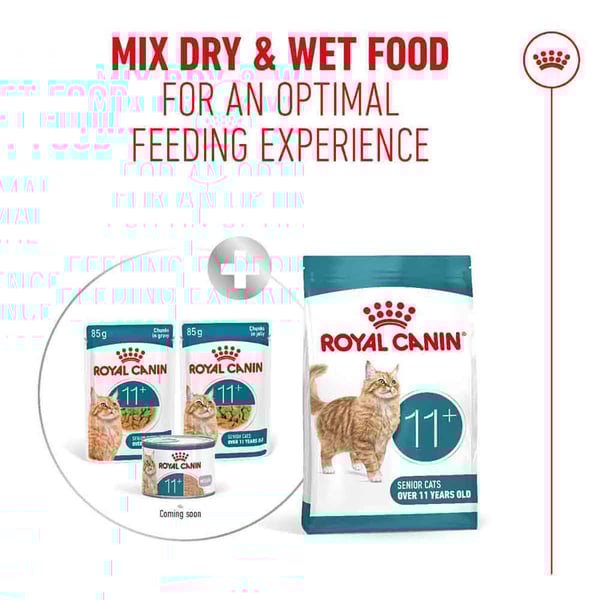 ROYAL CANIN AGEING 11+ je k dispozici v různých texturách, včetně kousků v omáčce, extra jemné pěny a jako suché krmivo.