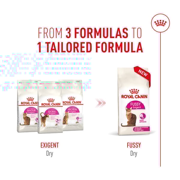 Abychom vybíravým kočkám poskytli výživu s maximální chutí, kombinuje receptura Fussy naše 3 dřívější receptury Exigent – Savour, Aroma a Protein – v jednom produktu: ROYAL CANIN Fussy.